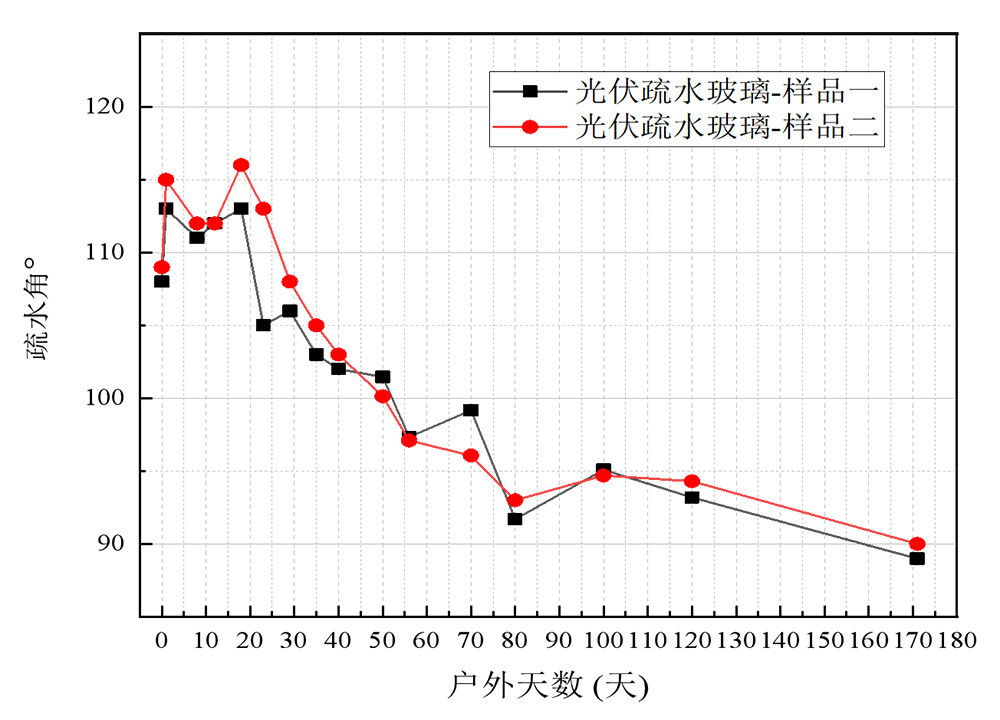 喷涂后AR91成人麻豆水接触角缓慢下降,50天内保持100°以上,六个月内保持90°以上,如下图所示